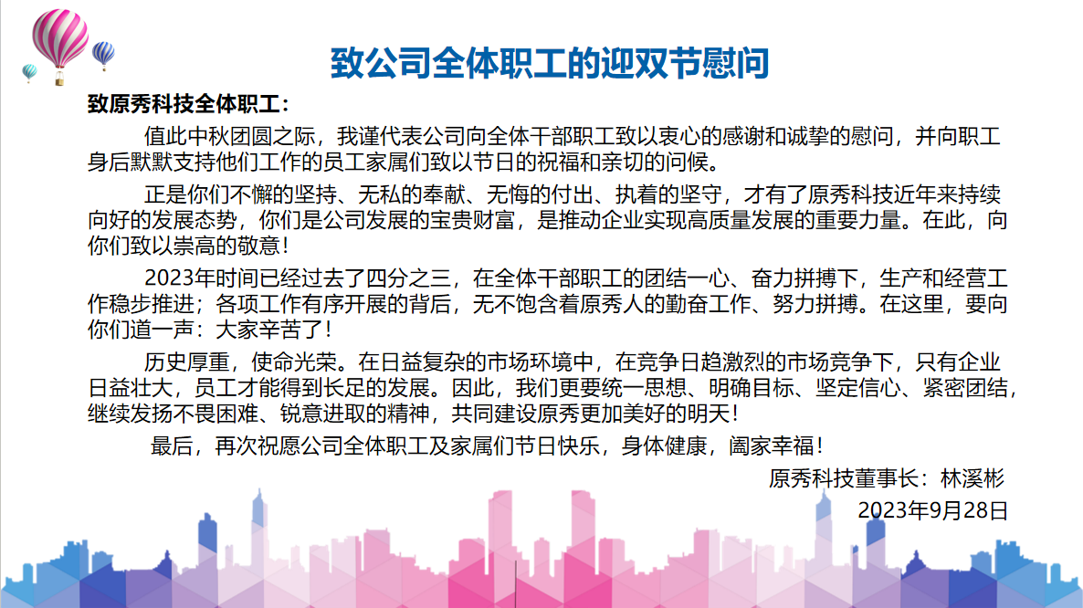 最后,值此佳節(jié),原秀科技祝愿全體職工雙節(jié)快樂,闔家美滿,共團圓!