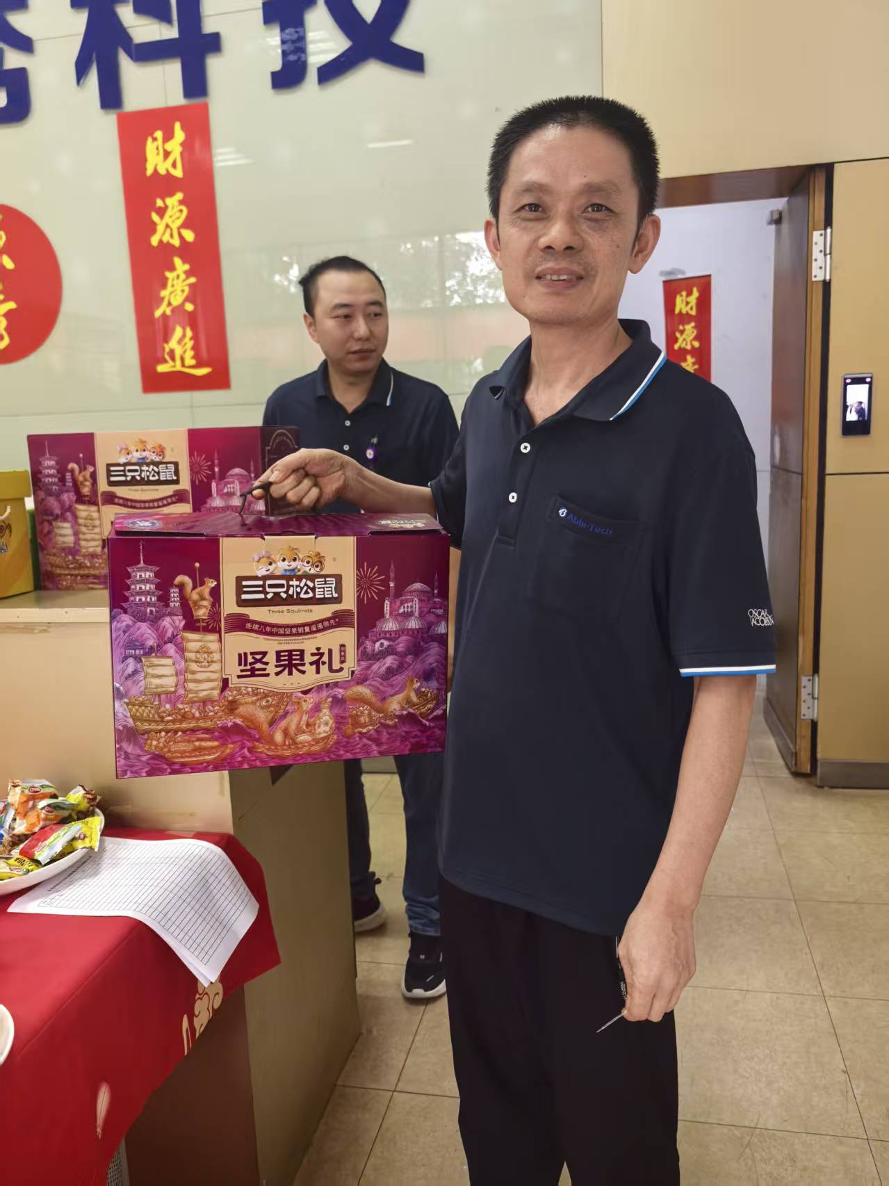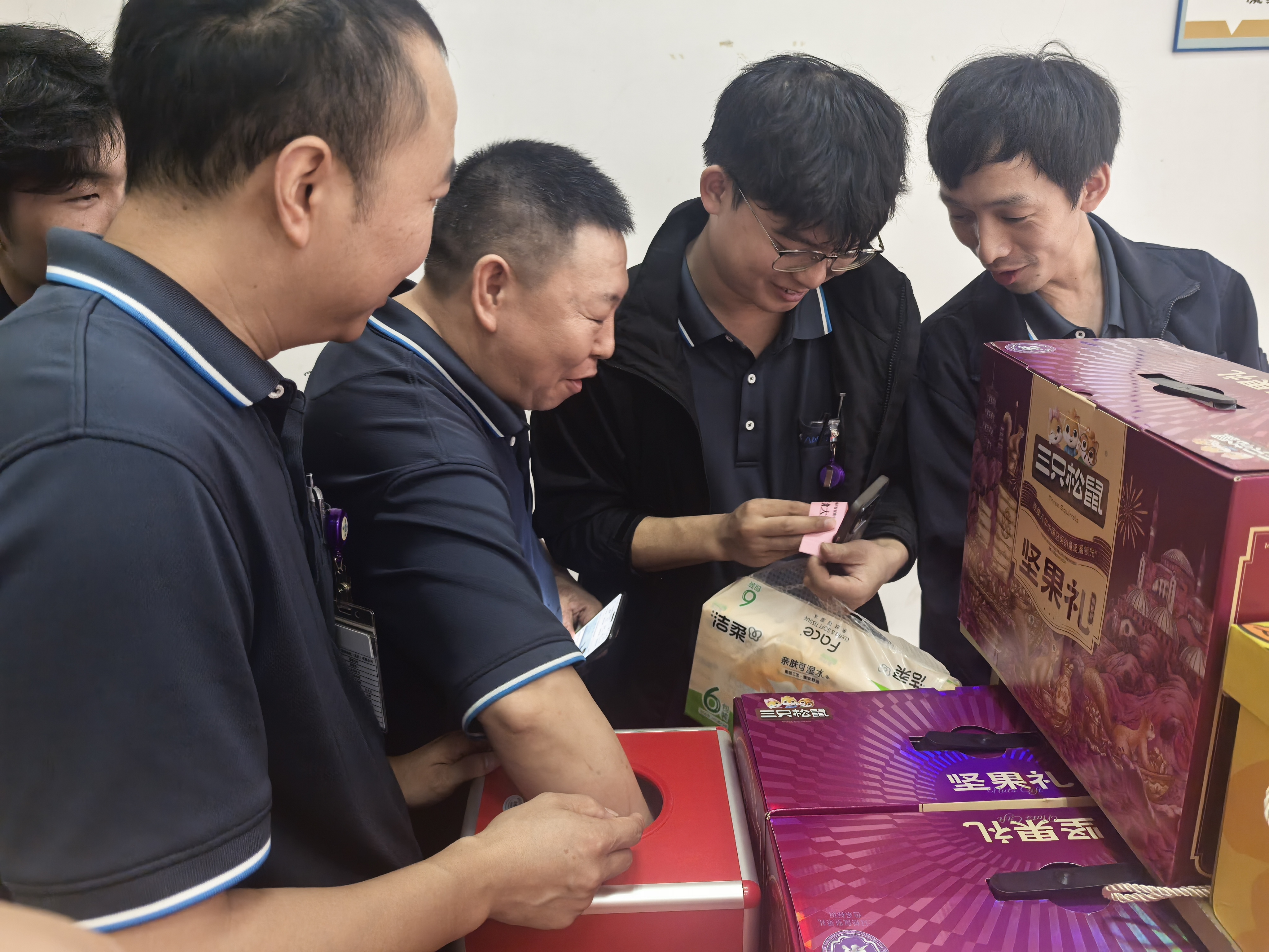 活動(dòng)采用“積分制”激勵(lì)機(jī)制,員工通過(guò)參與各項(xiàng)游戲和打卡活動(dòng)積累積分,最終憑積分參與抽獎(jiǎng)。積分滿5分即可抽取一次盲盒抽獎(jiǎng)機(jī)會(huì),獎(jiǎng)品包括堅(jiān)果禮盒、零食大禮包、糖果禮盒、中秋燈籠、擺件盲盒等精美禮品。此外,積分未滿5分的員工也可領(lǐng)取一份月餅或折扇作為紀(jì)念。盲盒抽獎(jiǎng)環(huán)節(jié)尤為受歡迎,當(dāng)抽中“神秘大獎(jiǎng)”時(shí),現(xiàn)場(chǎng)掌聲雷動(dòng),歡呼聲此起彼伏。首位抽中堅(jiān)果禮盒的生產(chǎn)部員工,笑道:“今天真的是太幸運(yùn)了!”